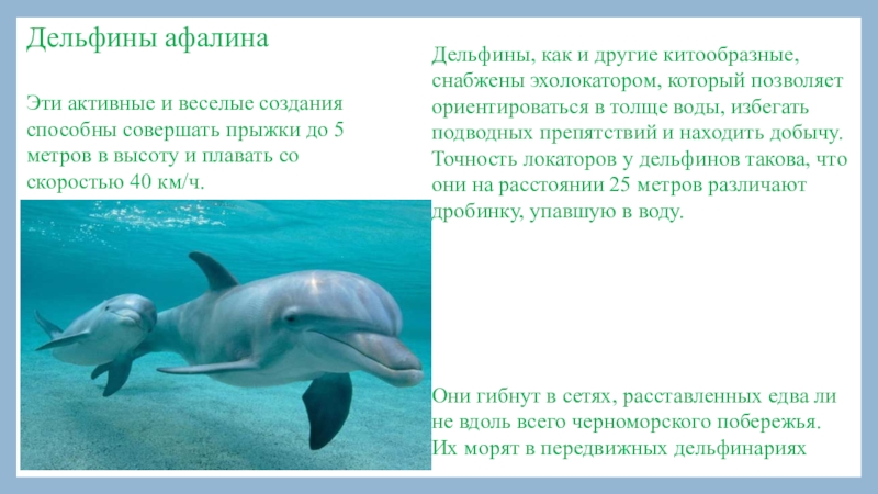 Дельфины, как и другие китообразные, снабжены эхолокатором, который позволяет ориентироваться в толще воды, избегать подводных препятствий и находить добычу. Точность локаторов у дельфинов такова, что они на расстоянии 25 метров различают дробинку, упавшую в воду.