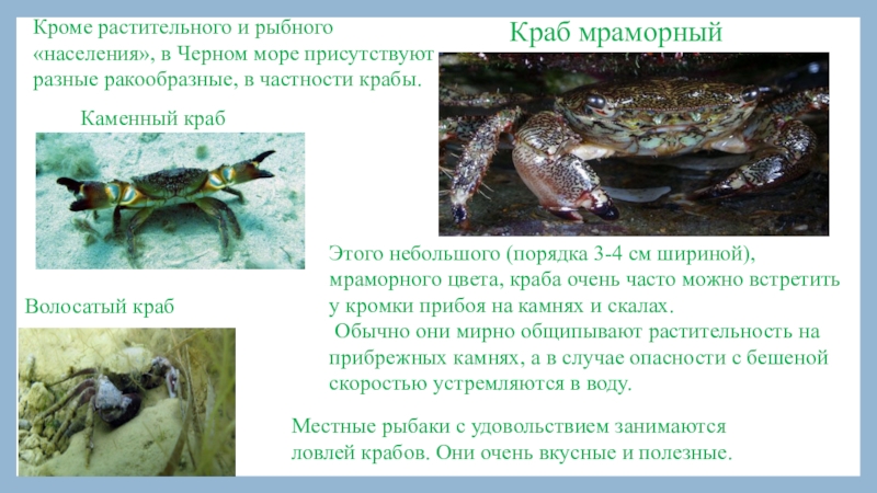 Кроме растительного и рыбного «населения», в Черном море присутствуют разные ракообразные, в частности крабы.