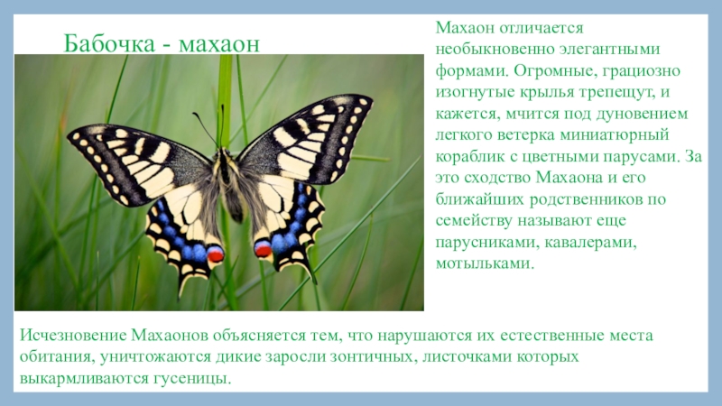 Исчезновение Махаонов объясняется тем, что нарушаются их естественные места обитания, уничтожаются дикие заросли зонтичных, листочками которых выкармливаются гусеницы.
