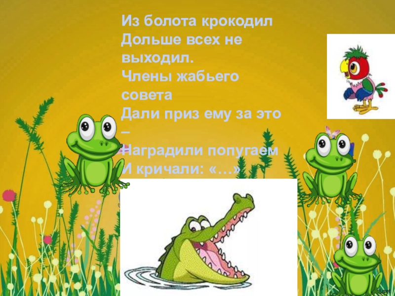 Слайд 3Из болота крокодил Дольше всех не выходил. Члены жабьего совета Дали приз ему за