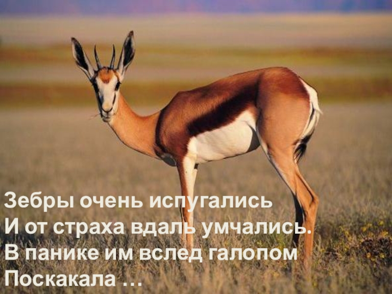 Слайд 15Зебры очень испугались И от страха вдаль умчались. В панике им вслед галопом Поскакала