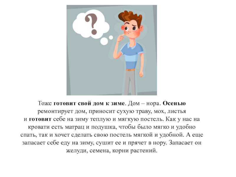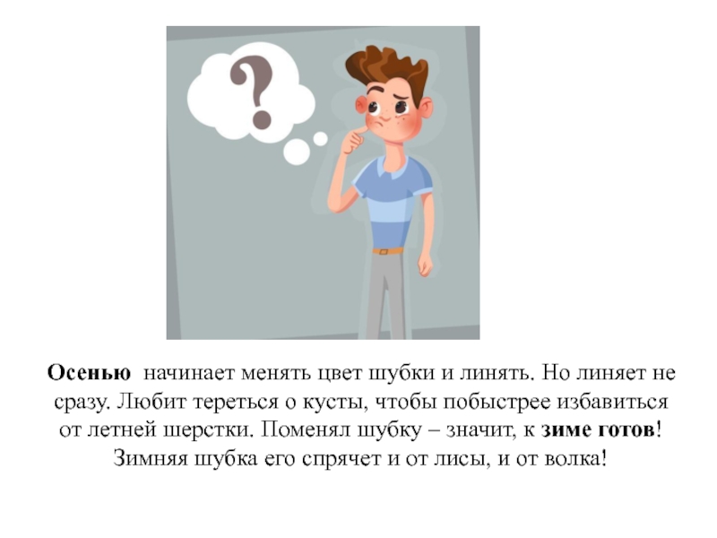 Любит тереться о кусты, чтобы побыстрее избавиться от летней шерстки. Поменял шубку – значит, к зиме готов! Зимняя шубка его спрячет и от лисы, и от волка!