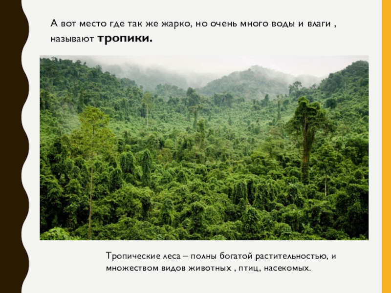 Тропические леса – полны богатой растительностью, и множеством видов животных , птиц, насекомых.