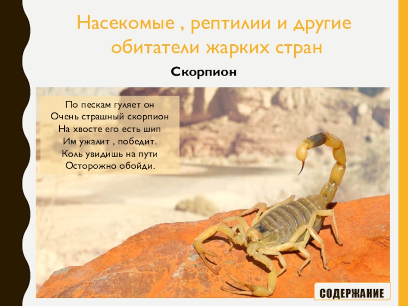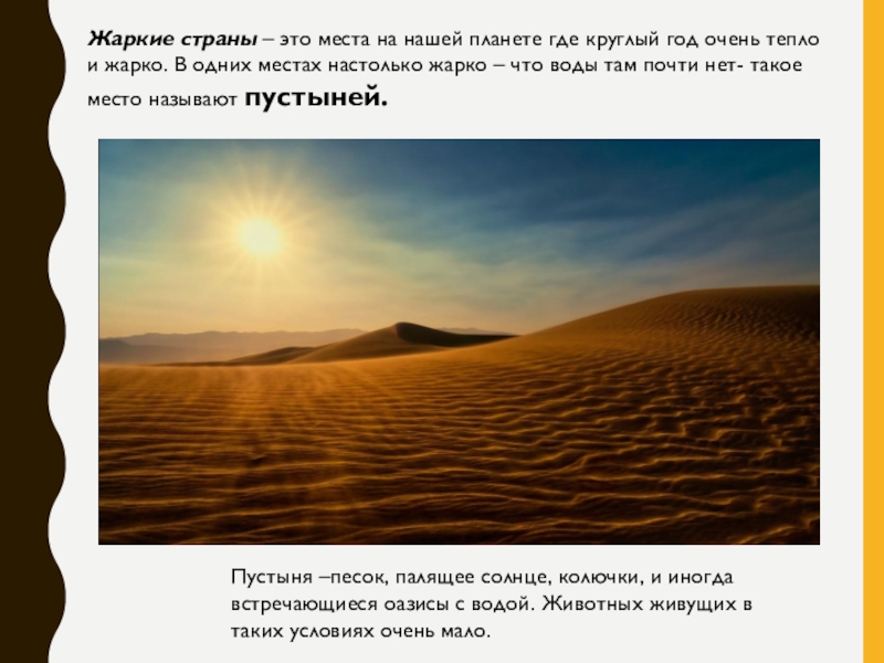 Пустыня –песок, палящее солнце, колючки, и иногда встречающиеся оазисы с водой. Животных живущих в таких условиях очень мало.