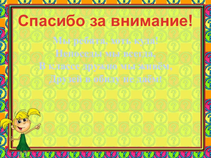 Мы ребята, хоть куда!Непоседы мы всегда,В классе дружно мы живём,Друзей в обиду не даём!Спасибо за внимание!