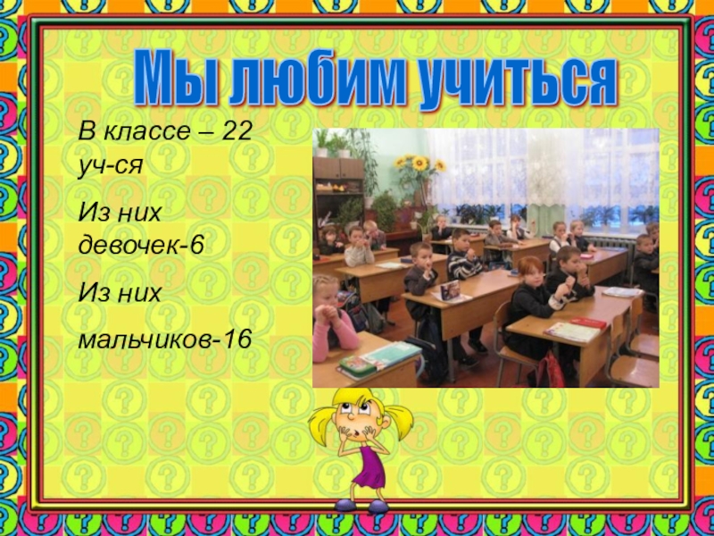 Мы любим учиться В классе – 22 уч-сяИз них девочек-6Из них мальчиков-16