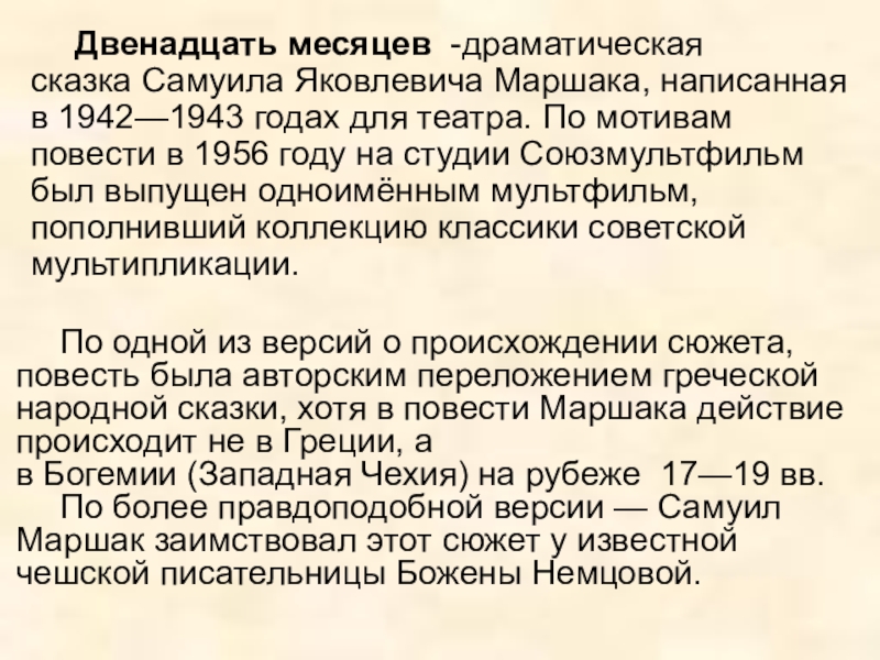 По одной из версий о происхождении сюжета, повесть была авторским переложением греческой народной сказки, хотя в повести Маршака действие происходит не в Греции, а в Богемии (Западная Чехия) на рубеже 17—19 вв. По более правдоподобной версии — Самуил Маршак заимствовал этот сюжет у известной чешской писательницы Божены Немцовой.