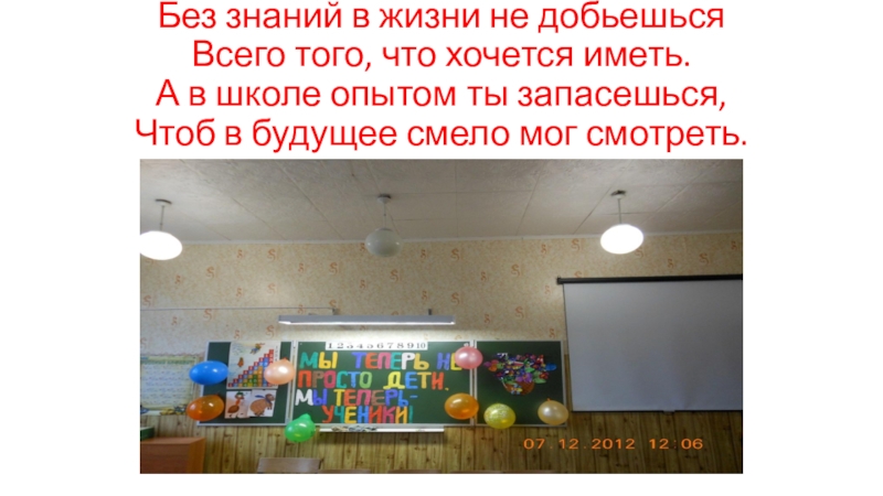 Без знаний в жизни не добьешься Всего того, что хочется иметь. А в школе опытом ты запасешься, Чтоб в будущее смело мог смотреть.