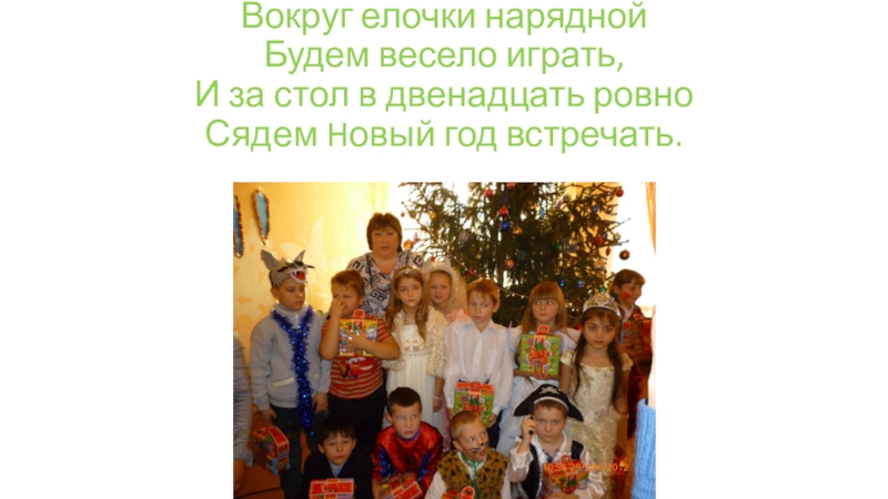 Вокруг елочки нарядной  Будем весело играть,  И за стол в двенадцать ровно  Сядем Hовый год встречать.