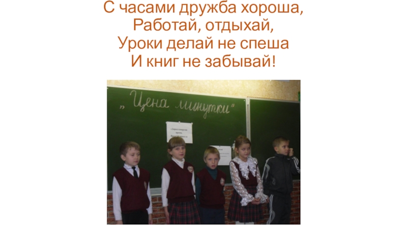 С часами дружба хороша, Работай, отдыхай, Уроки делай не спеша И книг не забывай!