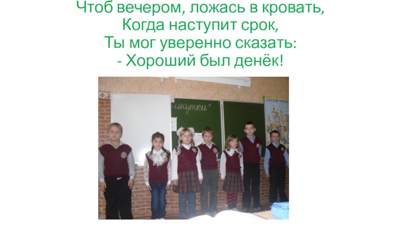 Слайд 13 Чтоб вечером, ложась в кровать, Когда наступит срок, Ты мог уверенно сказать: - Хороший