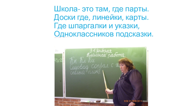 Слайд 3 Школа- это там, где парты. Доски где, линейки, карты. Где шпаргалки и указки, Одноклассников