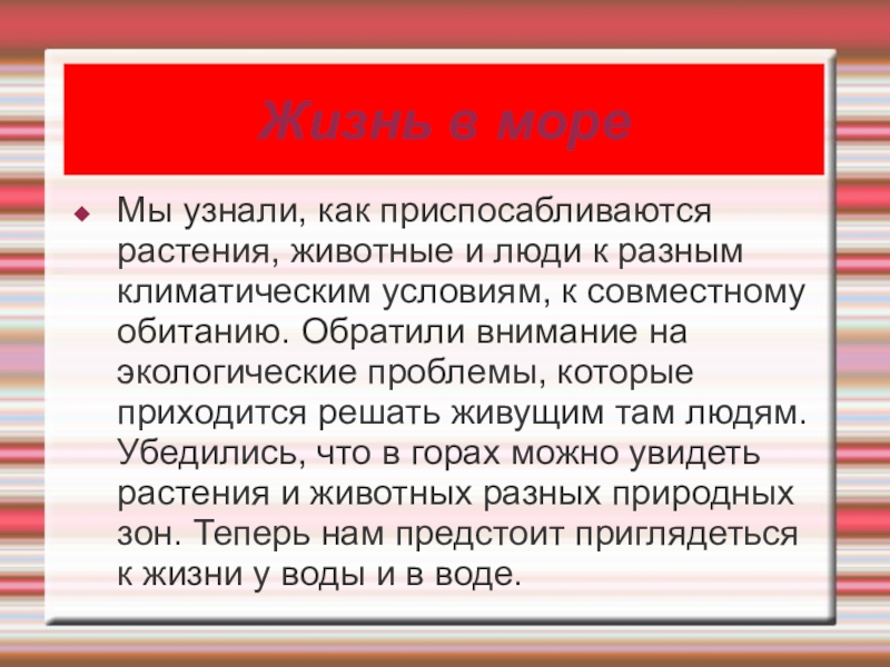 разным климатическим условиям, к совместному обитанию. Обратили внимание на экологические проблемы, которые приходится решать живущим там людям. Убедились, что в горах можно увидеть растения и животных разных природных зон. Теперь нам предстоит приглядеться к жизни у воды и в воде.