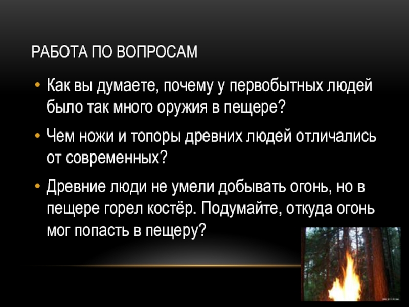 Работа по вопросамКак вы думаете, почему у первобытных людей было так много оружия в пещере?Чем ножи и