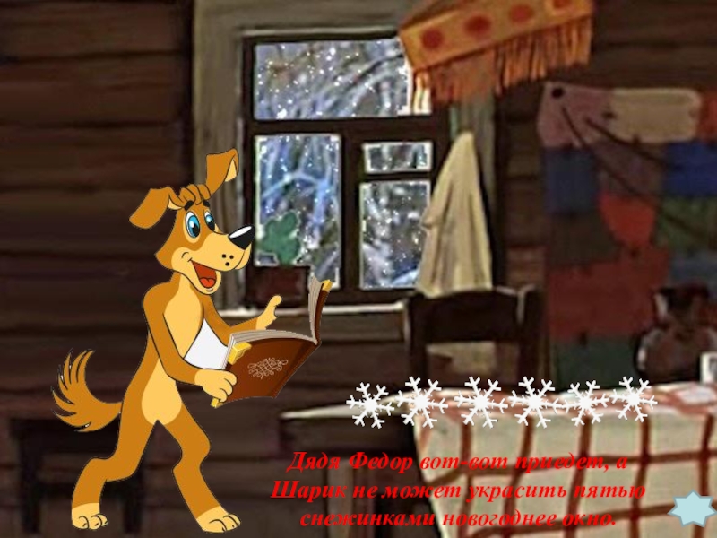 Дядя Федор вот-вот приедет, а Шарик не может украсить пятью снежинками новогоднее окно.