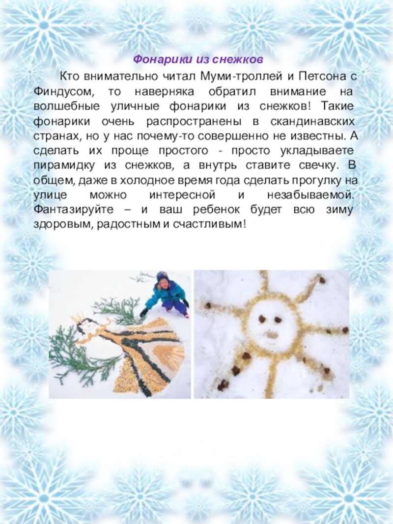 то наверняка обратил внимание на волшебные уличные фонарики из снежков! Такие фонарики очень распространены в скандинавских странах, но у нас почему-то совершенно не известны. А сделать их проще простого - просто укладываете пирамидку из снежков, а внутрь ставите свечку. В общем, даже в холодное время года сделать прогулку на улице можно интересной и незабываемой. Фантазируйте – и ваш ребенок будет всю зиму здоровым, радостным и счастливым!