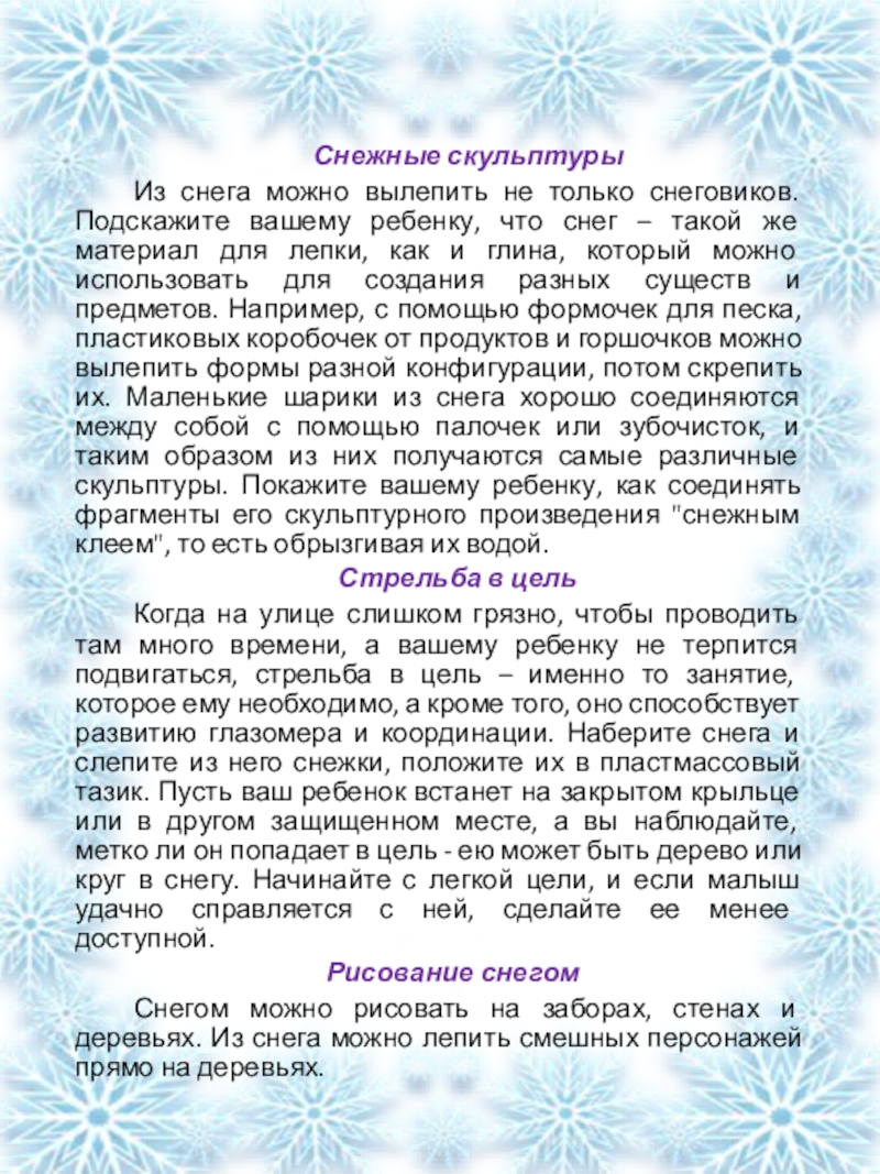 Из снега можно вылепить не только снеговиков. Подскажите вашему ребенку, что снег – такой же материал для лепки, как и глина, который можно использовать для создания разных существ и предметов. Например, с помощью формочек для песка, пластиковых коробочек от продуктов и горшочков можно вылепить формы разной конфигурации, потом скрепить их. Маленькие шарики из снега хорошо соединяются между собой с помощью палочек или зубочисток, и таким образом из них получаются самые различные скульптуры. Покажите вашему ребенку, как соединять фрагменты его скульптурного произведения "снежным клеем", то есть обрызгивая их водой.