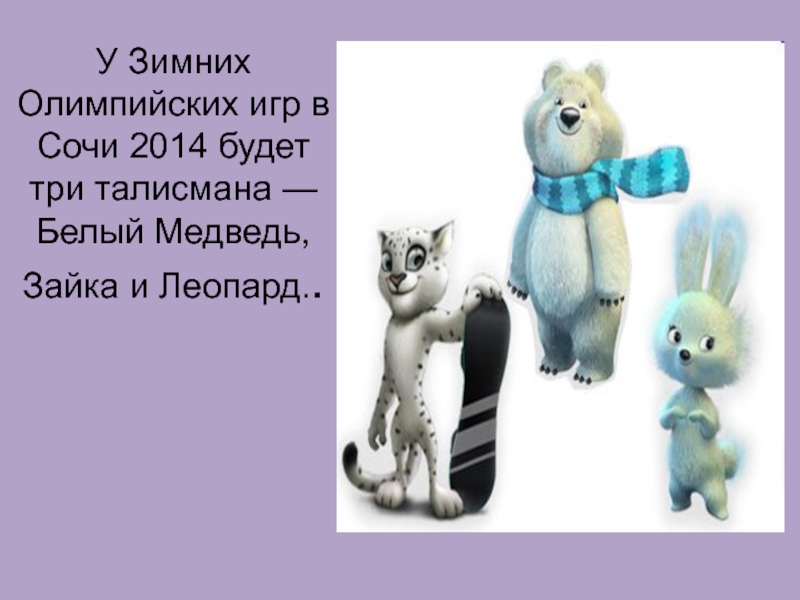 Слайд 45У Зимних Олимпийских игр в Сочи 2014 будет три талисмана —