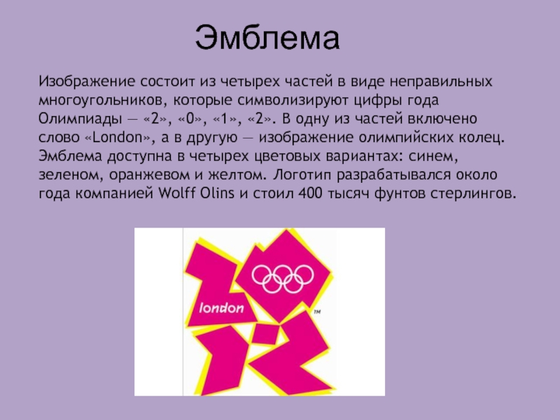 цифры года Олимпиады — «2», «0», «1», «2». В одну из частей включено слово «London», а в другую — изображение олимпийских колец. Эмблема доступна в четырех цветовых вариантах: синем, зеленом, оранжевом и желтом. Логотип разрабатывался около года компанией Wolff Olins и стоил 400 тысяч фунтов стерлингов.