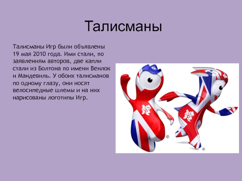 заявлениям авторов, две капли стали из Болтона по имени Венлок и Мандевиль. У обоих талисманов по одному глазу, они носят велосипедные шлемы и на них нарисованы логотипы Игр.
