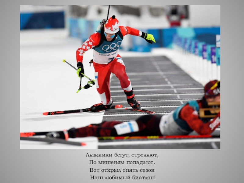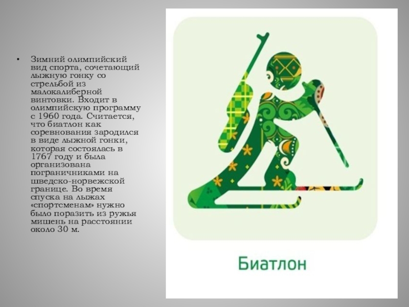 Слайд 3Зимний олимпийский вид спорта, сочетающий лыжную гонку со стрельбой из малокалиберной