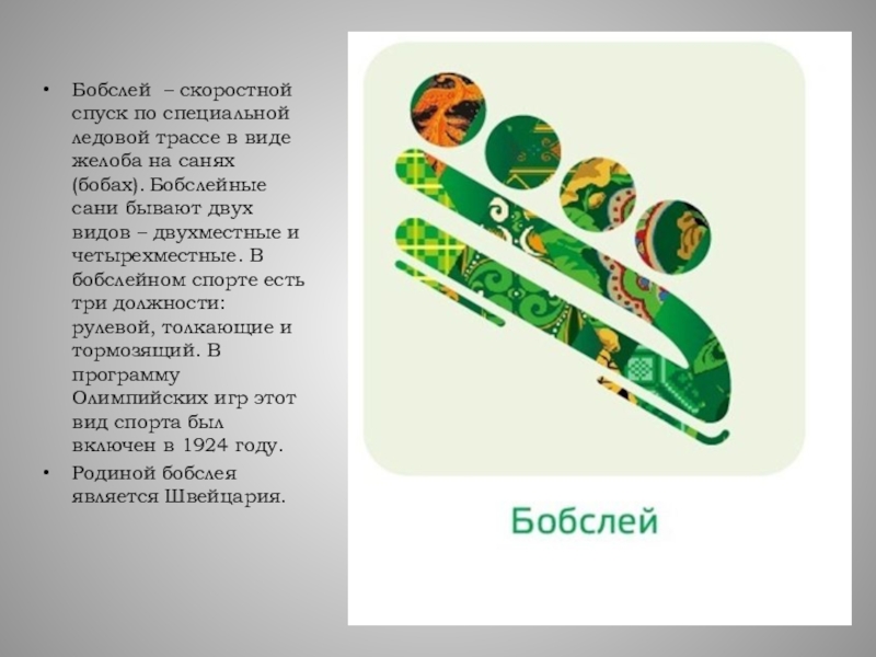 на санях (бобах). Бобслейные сани бывают двух видов – двухместные и четырехместные. В бобслейном спорте есть три должности: рулевой, толкающие и тормозящий. В программу Олимпийских игр этот вид спорта был включен в 1924 году.