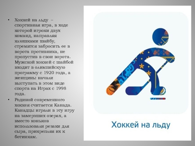 Слайд 29Хоккей на льду – спортивная игра, в ходе которой игроки двух