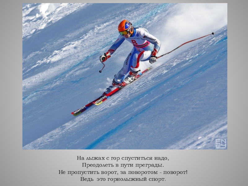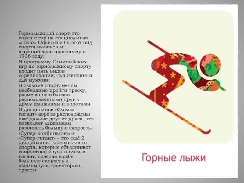 Слайд 7Горнолыжный спорт-это спуск с гор на специальных лыжах. Официально этот вид