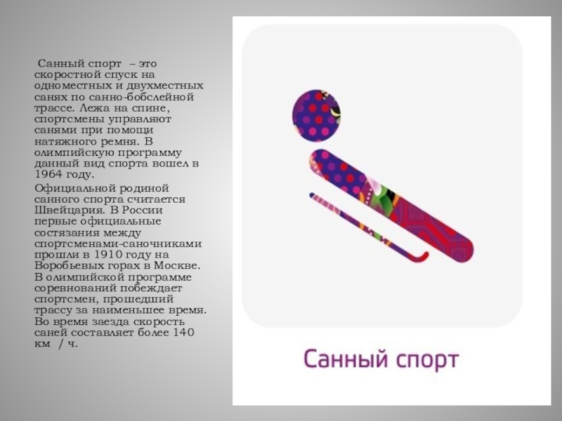 санях по санно-бобслейной трассе. Лежа на спине, спортсмены управляют санями при помощи натяжного ремня. В олимпийскую программу данный вид спорта вошел в 1964 году.