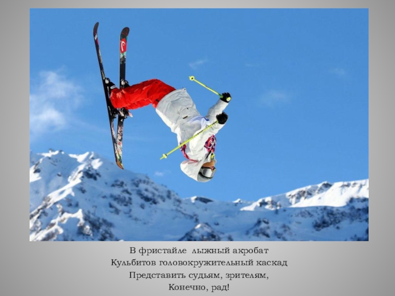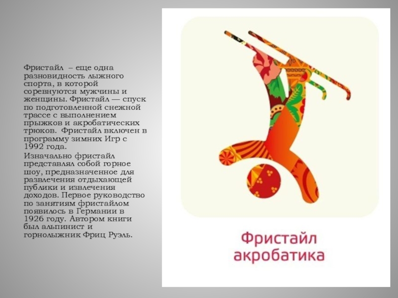 Слайд 27Фристайл – еще одна разновидность лыжного спорта, в которой соревнуются мужчины