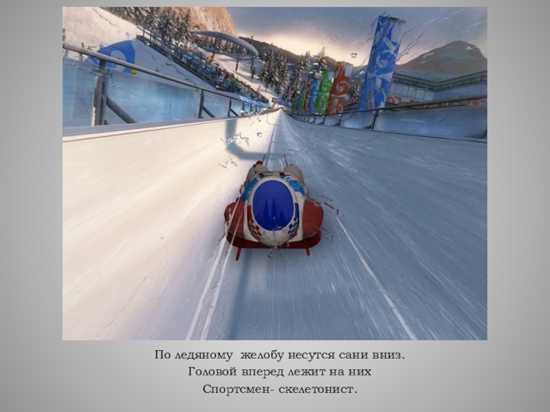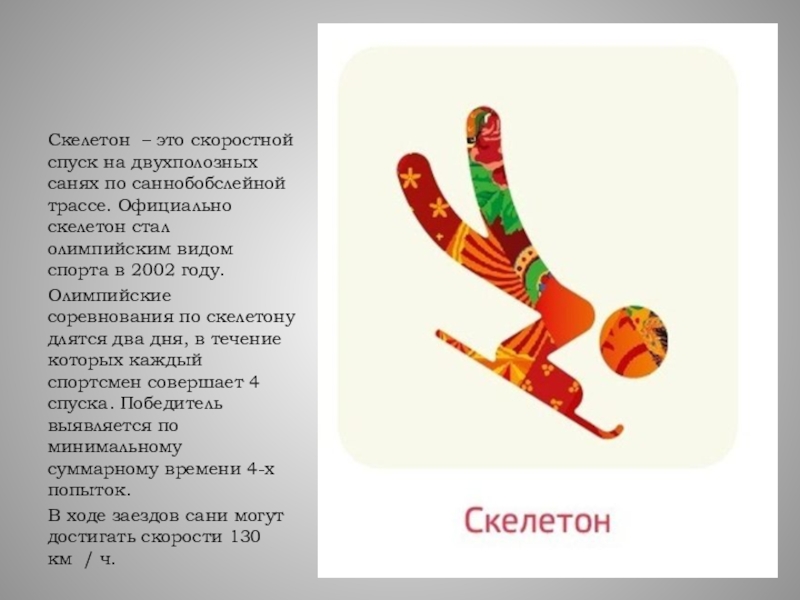 Слайд 21Скелетон – это скоростной спуск на двухполозных санях по саннобобслейной трассе.