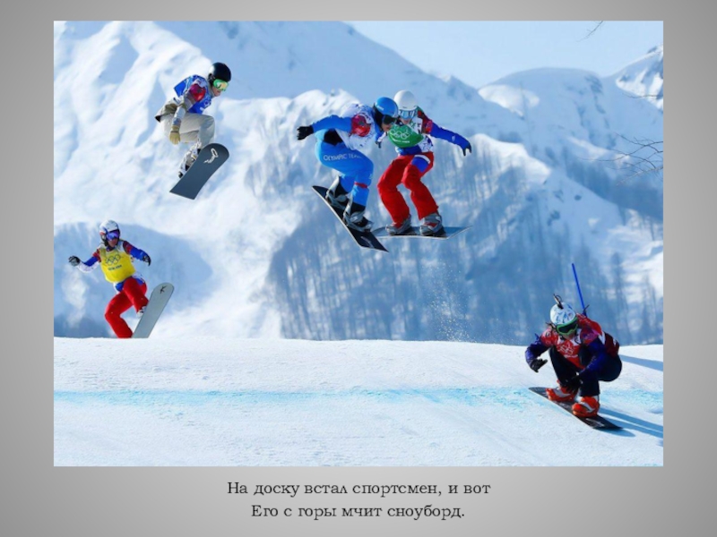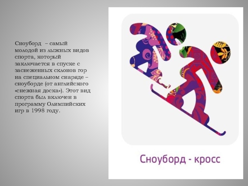 спуске с заснеженных склонов гор на специальном снаряде – сноуборде (от английского «снежная доска»). Этот вид спорта был включен в программу Олимпийских игр в 1998 году.
