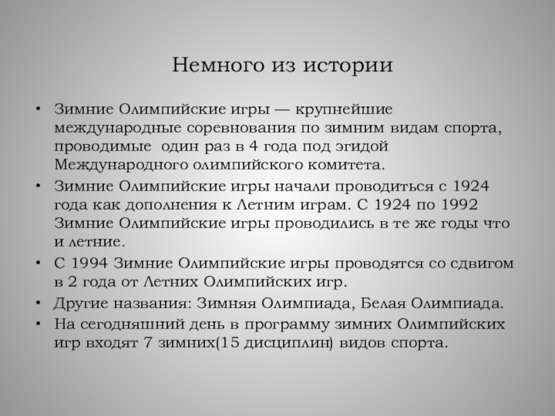 Зимние Олимпийские игры начали проводиться с 1924 года как дополнения к Летним играм. С 1924 по 1992 Зимние Олимпийские игры проводились в те же годы что и летние.