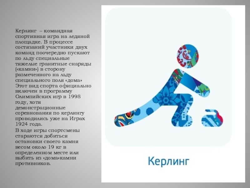 Слайд 9Керлинг – командная спортивная игра на ледяной площадке. В процессе состязаний
