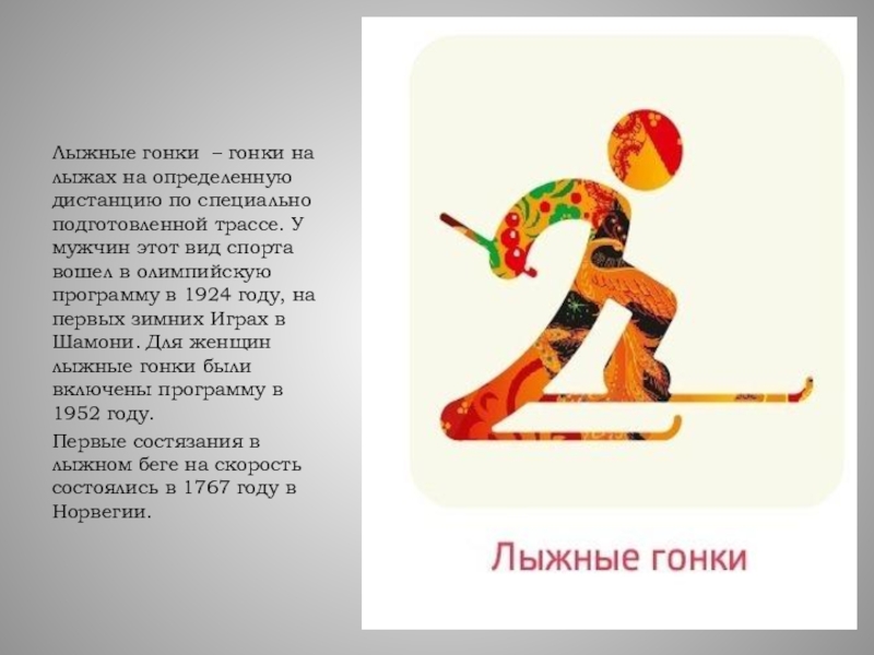 подготовленной трассе. У мужчин этот вид спорта вошел в олимпийскую программу в 1924 году, на первых зимних Играх в Шамони. Для женщин лыжные гонки были включены программу в 1952 году.