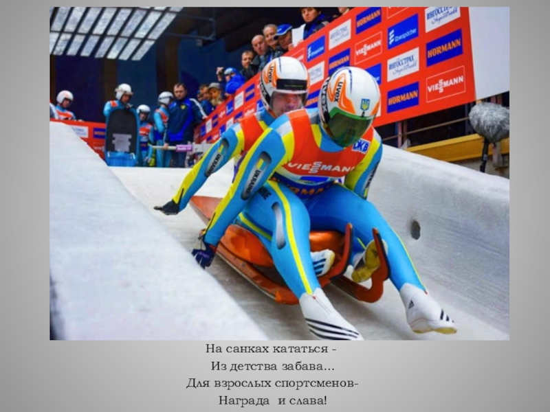 Слайд 19 Санный спорт – это скоростной спуск на одноместных и двухместных