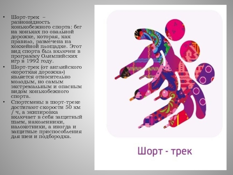 Слайд 31Шорт-трек – разновидность конькобежного спорта: бег на коньках по овальной дорожке,