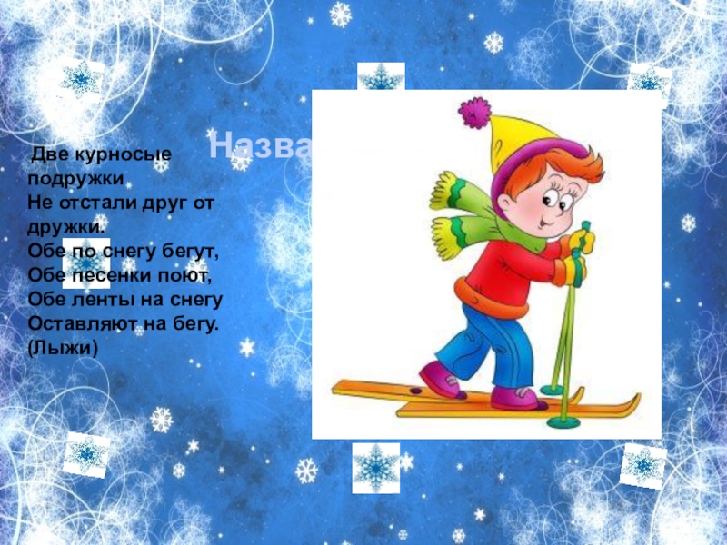 Название списка Две курносые подружки Не отстали друг от дружки. Обе по снегу бегут, Обе песенки поют, Обе ленты на снегу Оставляют на бегу. (Лыжи)