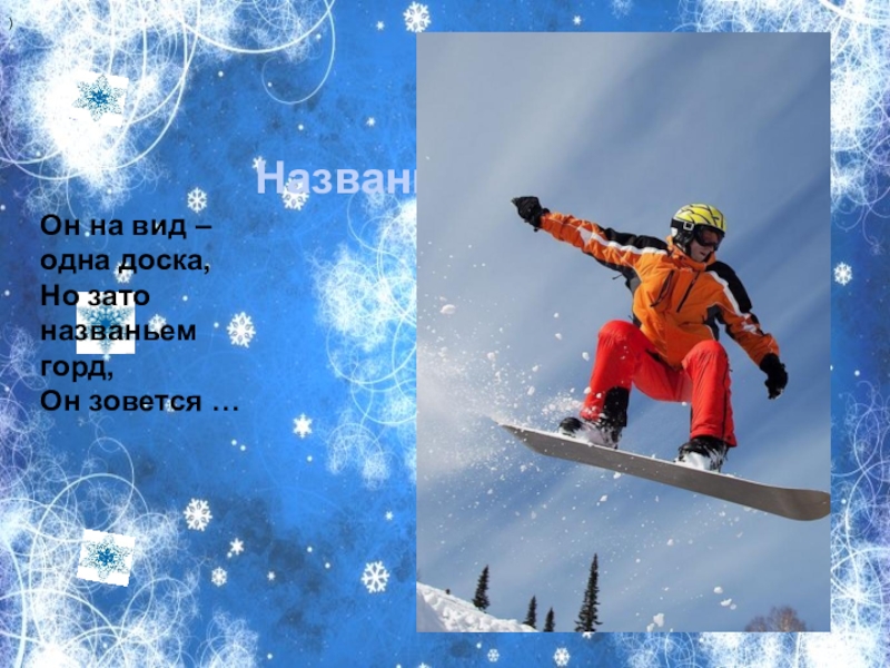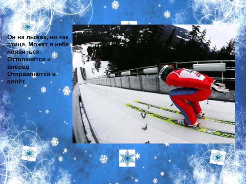 Название спискаОн на лыжах, но как птица, Может в небе появиться. Оттолкнётся и вперёд Отправляется в полёт.