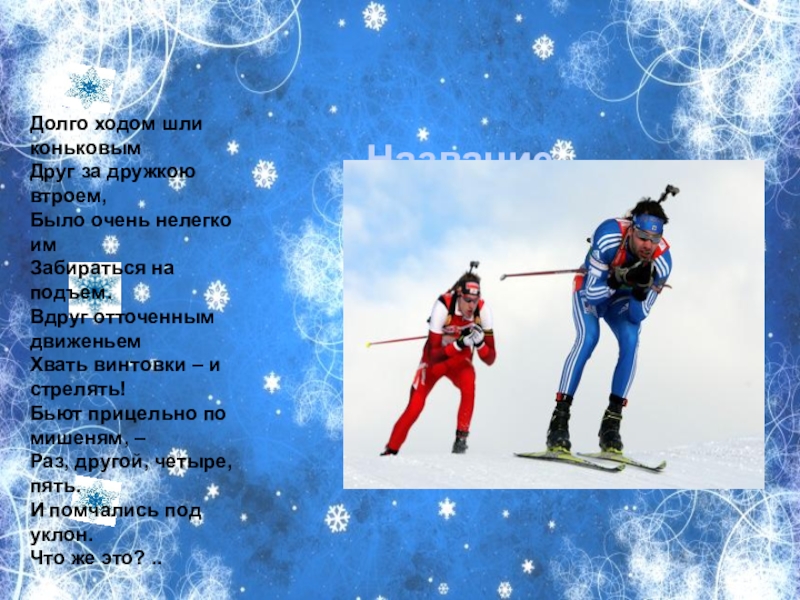 Название спискаДолго ходом шли коньковым Друг за дружкою втроем, Было очень нелегко им Забираться на подъем. Вдруг