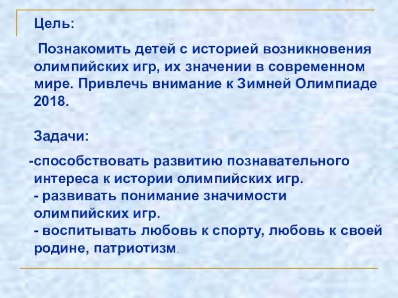 Познакомить детей с историей возникновения олимпийских игр, их значении в
