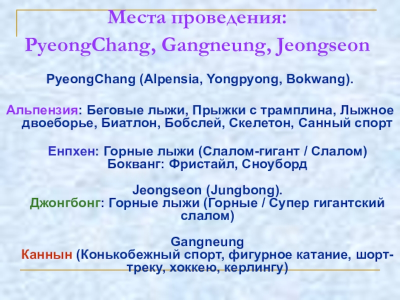 PyeongChang (Alpensia, Yongpyong, Bokwang).