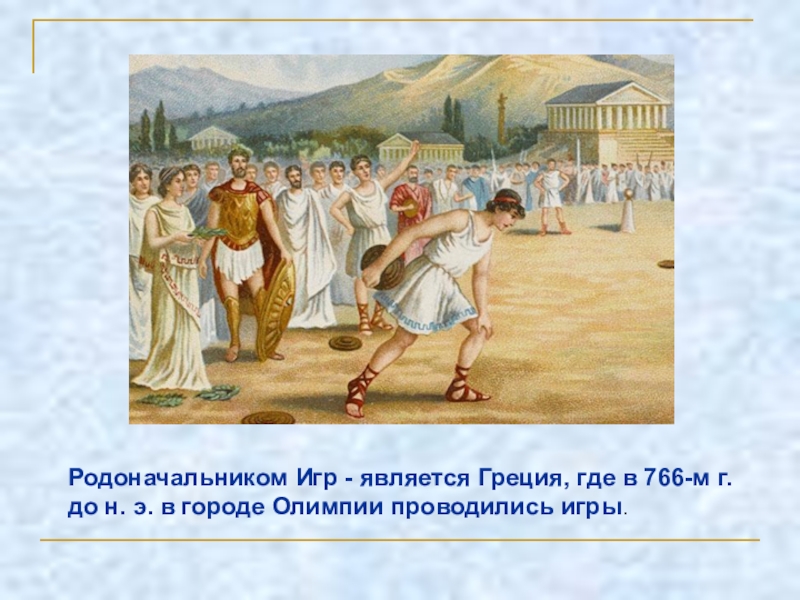 Слайд 4Родоначальником Игр - является Греция, где в 766-м г. до н.