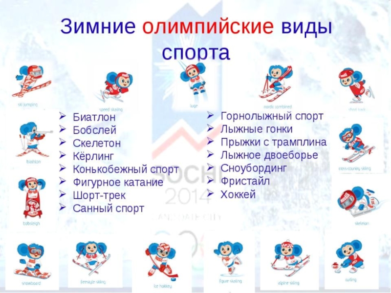 Прыжки с трамплина, Лыжное двоеборье, Биатлон, Бобслей, Скелетон, Санный спорт