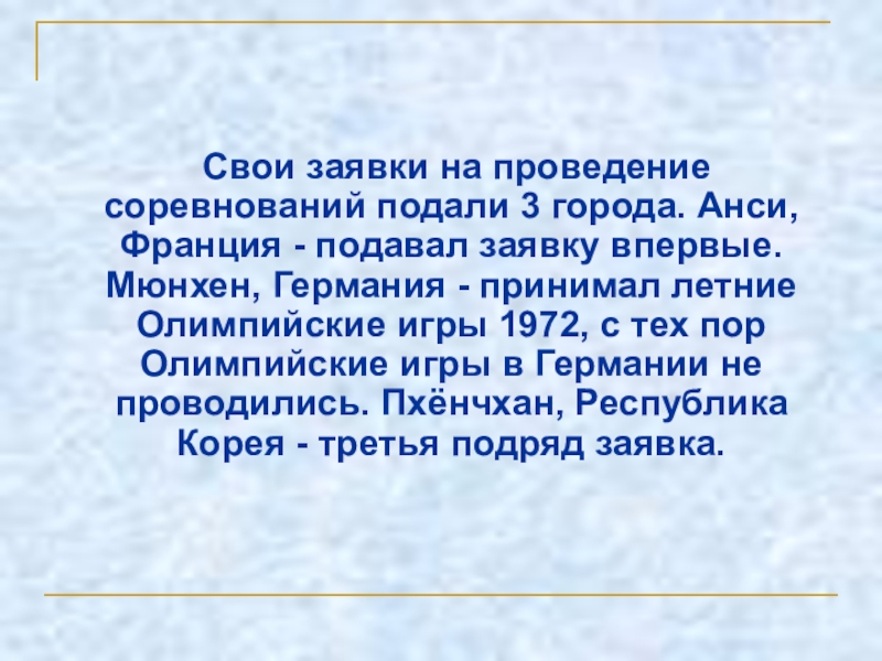 Слайд 8 Свои заявки на проведение соревнований подали 3 города. Анси, Франция -