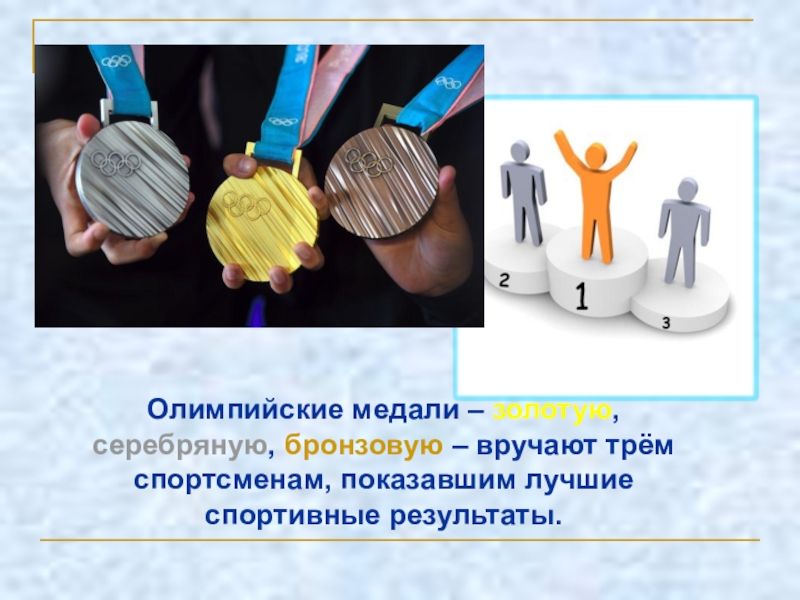 Слайд 16Олимпийские медали – золотую, серебряную, бронзовую – вручают трём спортсменам, показавшим лучшие