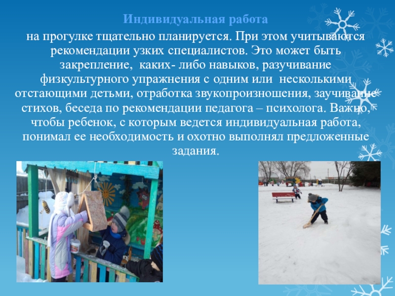 специалистов. Это может быть закрепление, каких- либо навыков, разучивание физкультурного упражнения с одним или несколькими отстающими детьми, отработка звукопроизношения, заучивание стихов, беседа по рекомендации педагога – психолога. Важно, чтобы ребенок, с которым ведется индивидуальная работа, понимал ее необходимость и охотно выполнял предложенные задания.