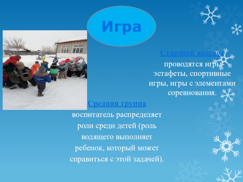 Средняя группа воспитатель распределяет роли среди детей (роль водящего выполняет ребенок, который может справиться с этой задачей).