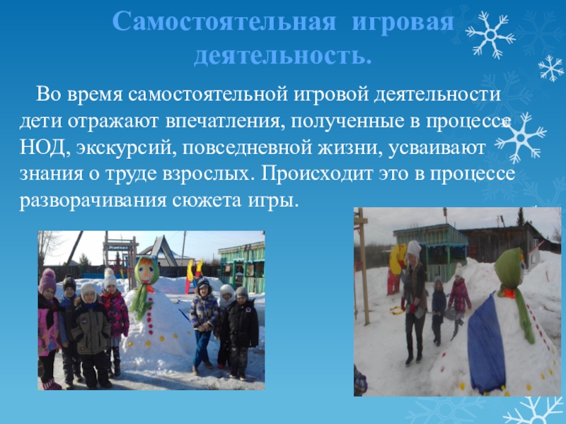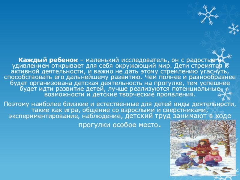 для себя окружающий мир. Дети стремятся к активной деятельности, и важно не дать этому стремлению угаснуть, способствовать его дальнейшему развитию. Чем полнее и разнообразнее будет организована детская деятельность на прогулке, тем успешнее будет идти развитие детей, лучше реализуются потенциальные возможности и детские творческие проявления.