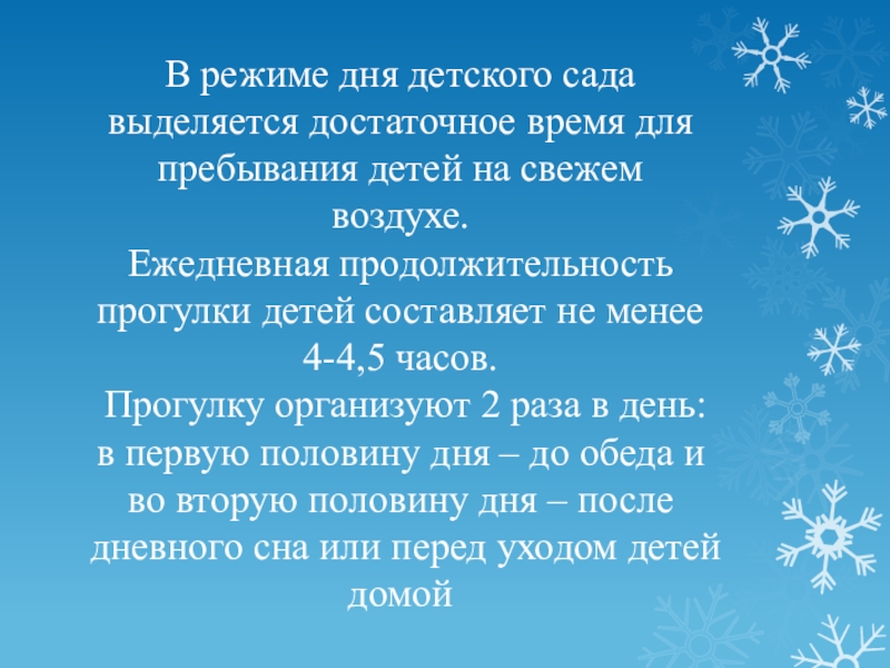 Ежедневная продолжительность прогулки детей составляет не менее 4-4,5 часов.